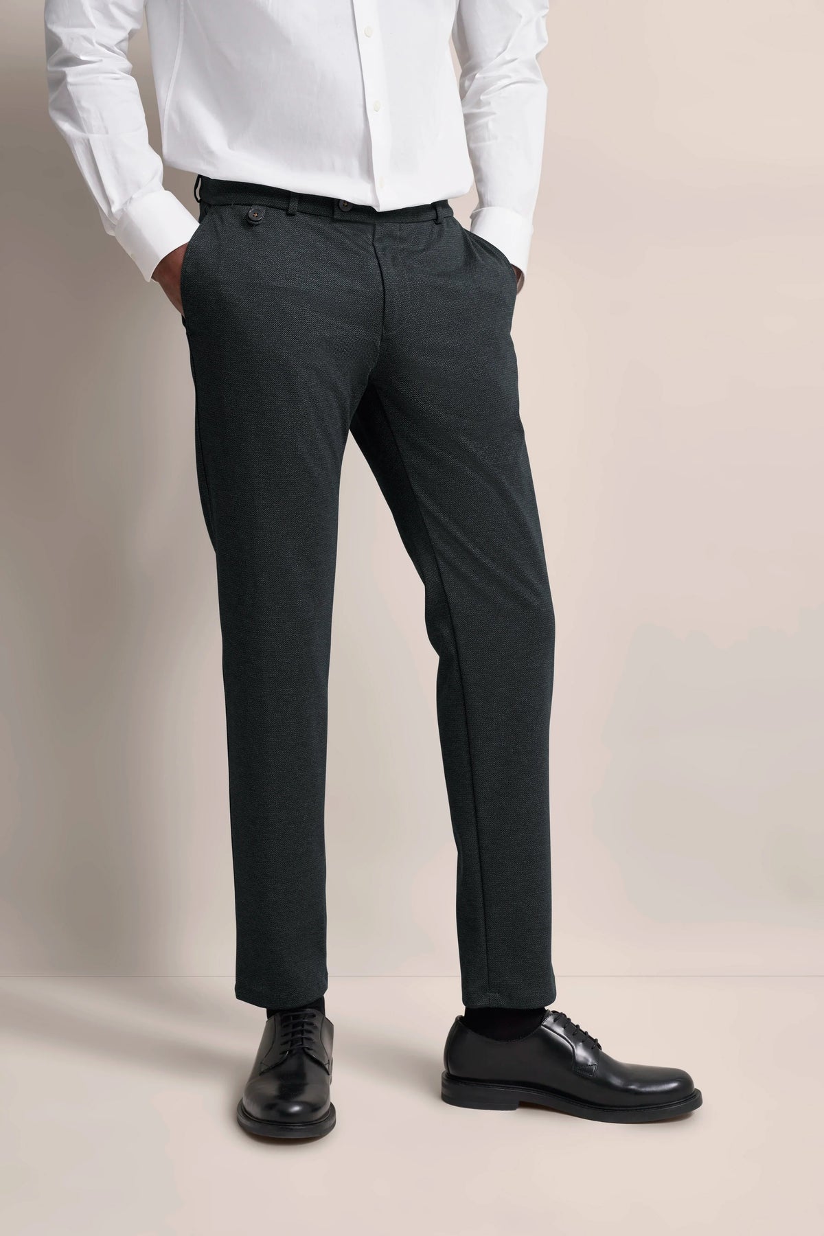 Fitted silhouette with modern flatfront finish